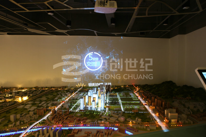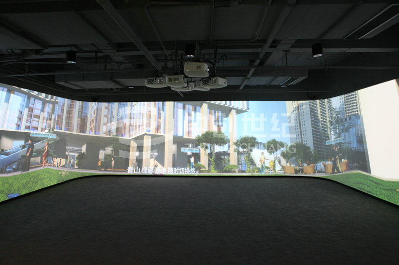 整個(gè)系統(tǒng)涉及擴(kuò)聲音響、投影顯示、液晶拼接、高清信號(hào)傳輸以及集中控制等系統(tǒng)組成。其中影院區(qū)采用3臺(tái)高清投影機(jī)融合滿足143度弧型顯示;沙盤(pán)區(qū)采用1臺(tái)高清投影機(jī)與1臺(tái)360度高清投影機(jī)拼接滿足L型幕的顯示;體驗(yàn)區(qū)采用6臺(tái)高清投影機(jī)整合滿足三面環(huán)幕顯示;品牌接待區(qū)采用3*3 46寸LED超窄邊液晶拼接大屏。